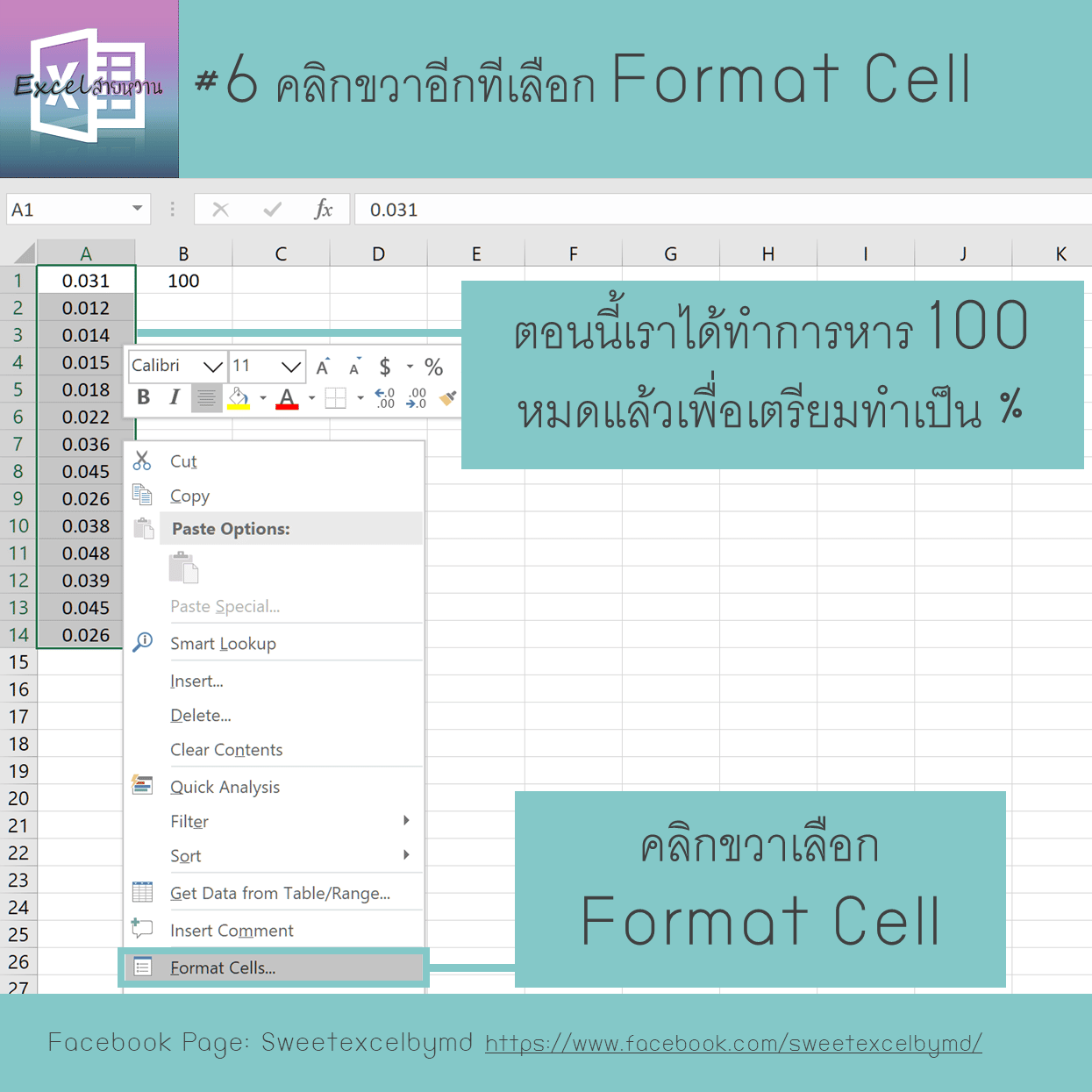 ครั้นจะคลิกขวา Format Cell ให้เป็น % แบบโต่ง ๆ จาก 3.1 ดันกลายเป็น 310% ซะงั้น ![]()