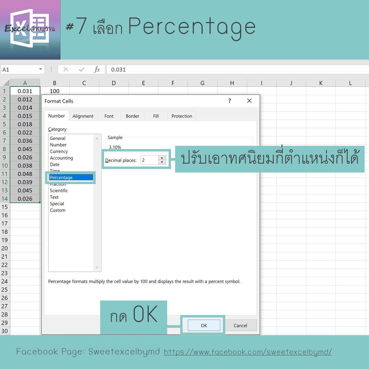 ถ้าไม่ได้มี Cell ที่ต้องแปลงเยอะ วิธีง่ายๆ คือ ใส่ที่ช่องสูตร =3.1/100 ก็จะได้ออกมาเป็น %