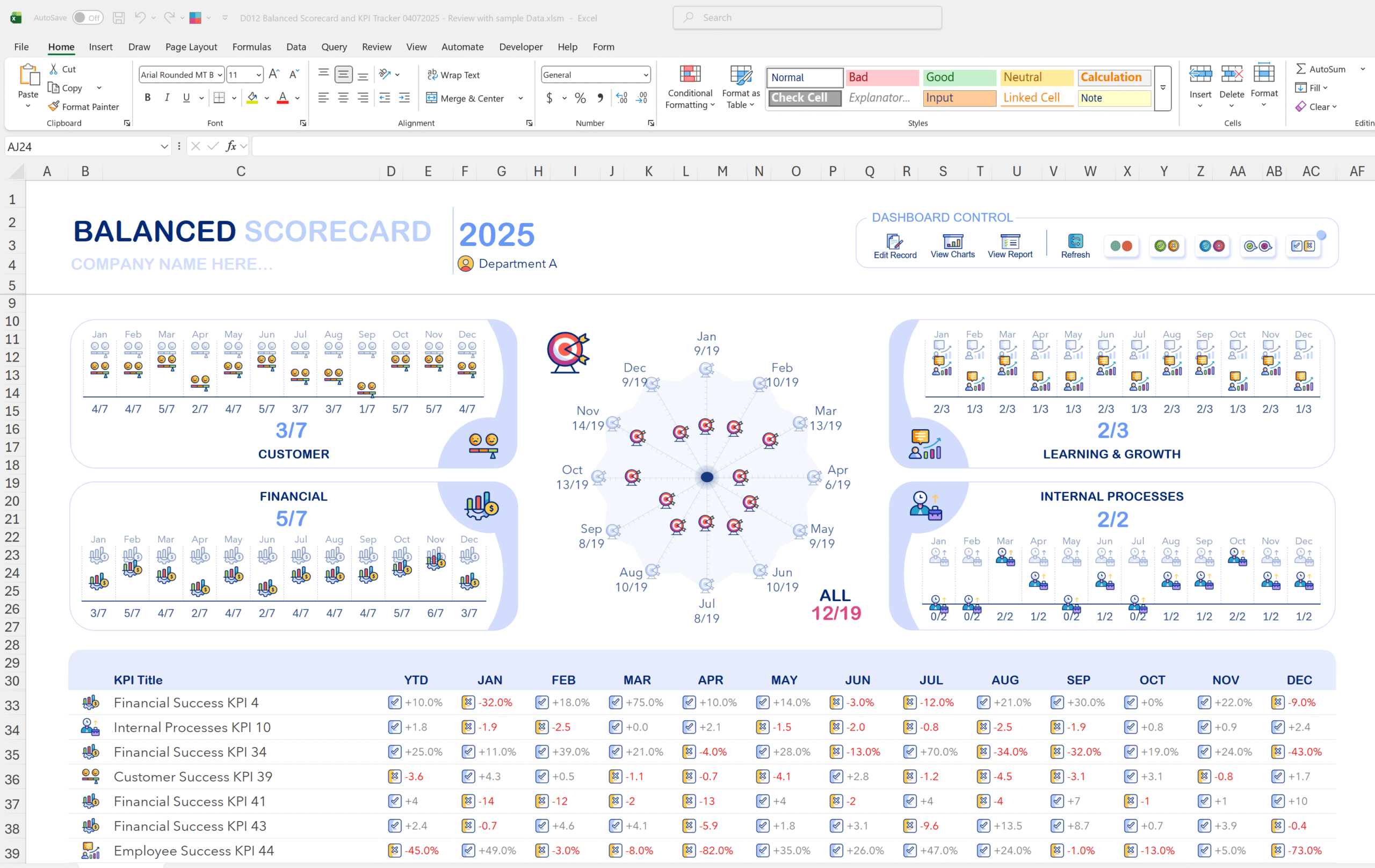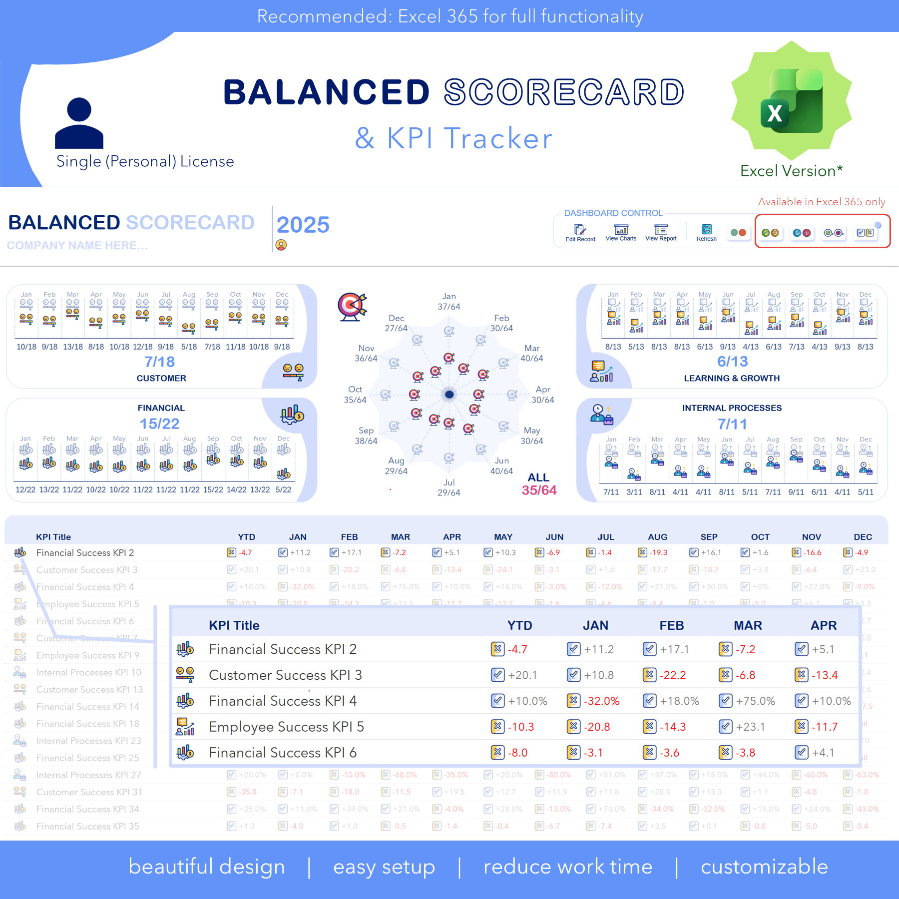 Template นี้จะช่วยให้เราติดตาม KPI ต่างๆ ดูว่าเราทำสำเร็จหรือไม่ พร้อมทั้งดูภาพรวมของ Balanced Scorecard ด้วย