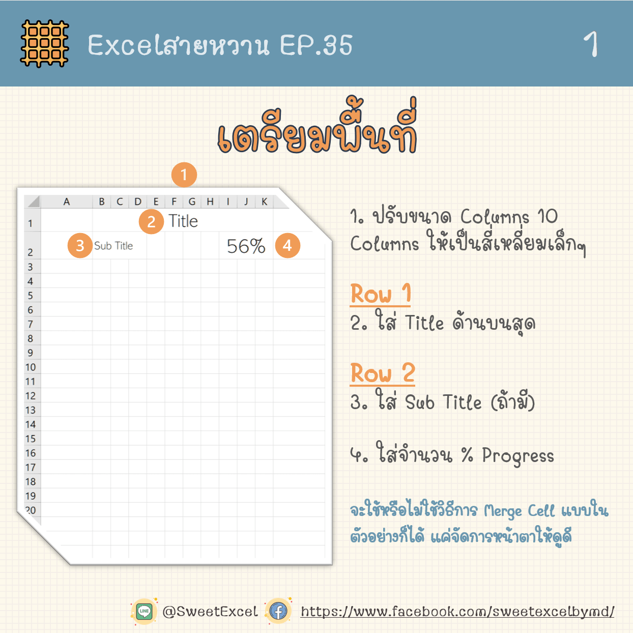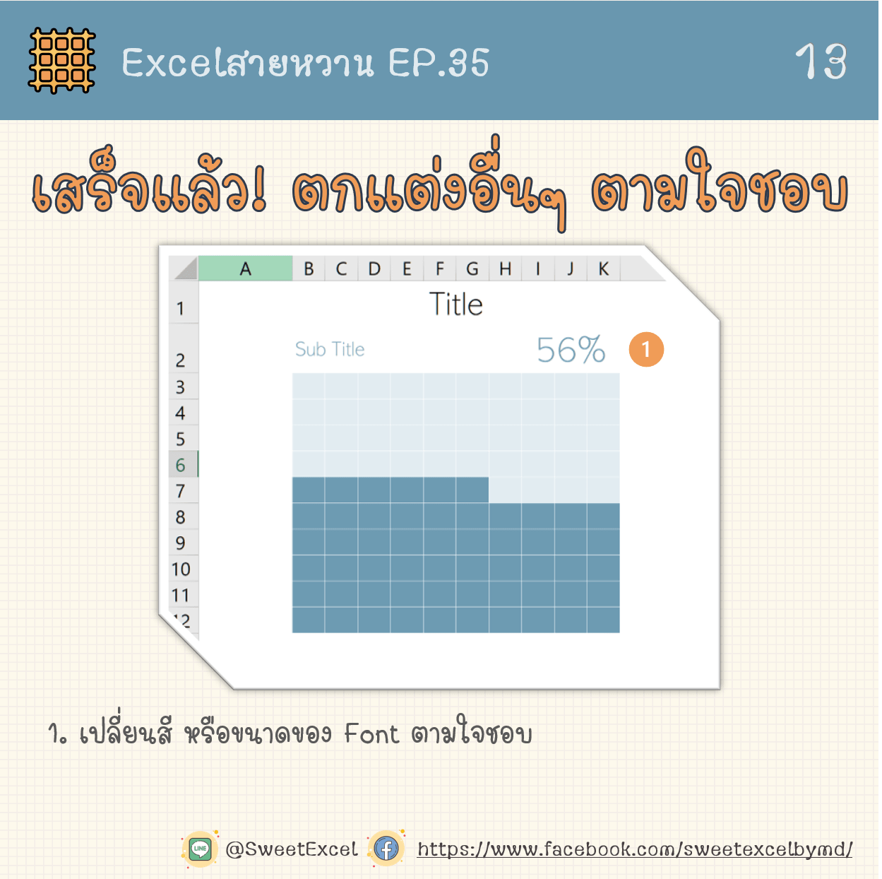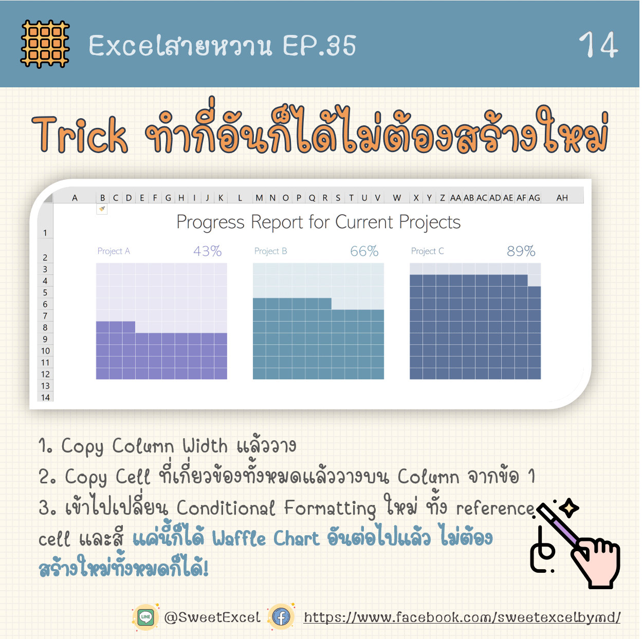 Waffle Chart เป็นอีกหนึ่ง Chart ที่ใช้ในการแสดง Progress ถึงแม้จะไม่มีในเมนู Insert -> Chart แต่ก็สามารถสร้างได้ไม่ยาก