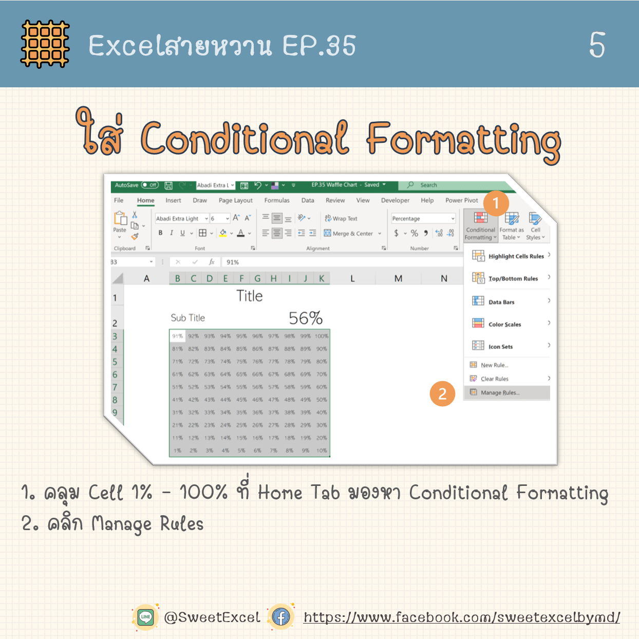 Waffle Chart สามารถสร้างได้หลายวิธี แต่ใน EP นี้แอดเลือกวิธีการสร้างด้วย Conditional Formatting มาสอน เพราะน่าจะเป็นวิธีที่ง่ายที่สุด รวดเร็ว ออกมาดูสวยงาม เป็นมืออาชีพ